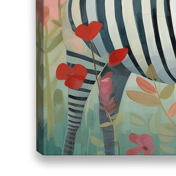 Zebra-Kunstwerk - Die Leinwand zeigt ein Zebra, das stattlich vor einem Hintergrund aus stilisierter Flora in sanften Pastell- und Erdtönen steht. Das Kontrastspiel zwischen den schwarzen und weißen Streifen des Zebras und den umgebenden Blumen erzeugt einen reizvollen visuellen Effekt, während die rosa Leinwand eine warme, einladende…