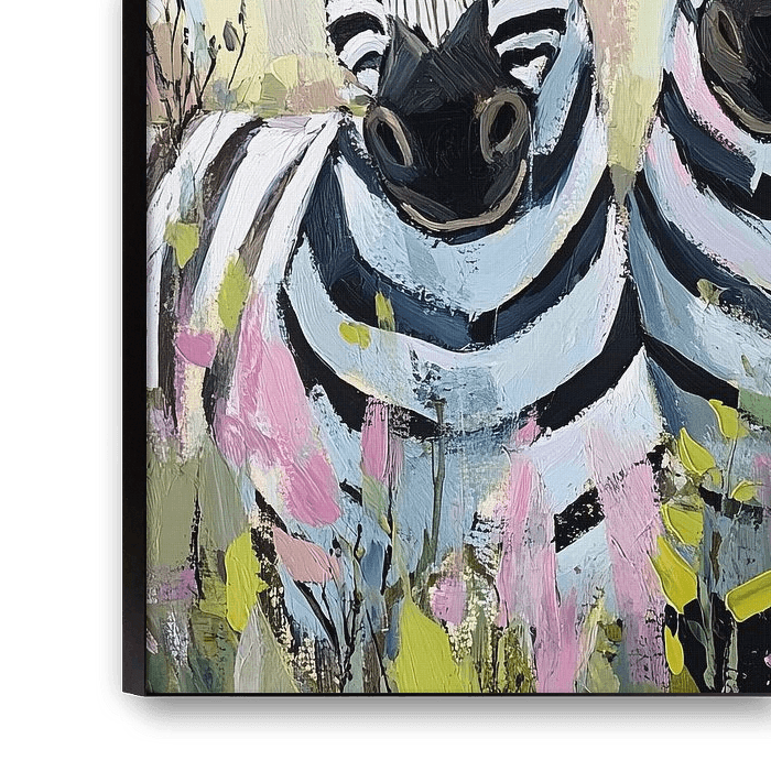 Zebra's - Dieses Tierbild zeigt zwei glückliche Zebras mit schwarzen und weißen Streifen und einem farbenfrohen Hintergrund aus sanften Tönen und Blumen, was es zu einem lebendigen Gartenbild macht.