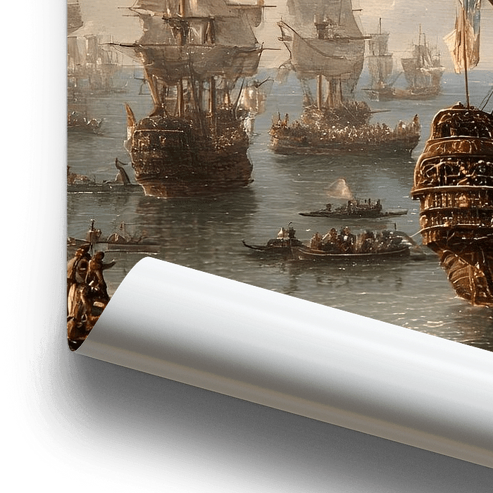Das Bild zeigt eine historische Hafenszene mit zahlreichen großen Segelschiffen, Barkassen und Beibooten. Im Zentrum liegt ein reich verziertes Handelsschiff vor Anker, umgeben von reger Aktivität auf dem Wasser. Im Hintergrund erstreckt sich eine dicht bebaute Küstenstadt. Die Darstellung ist im Stil eines maritimen Gemäldes des…