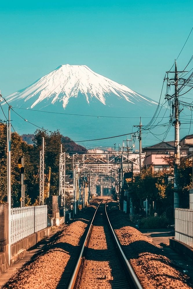 Einblick in eine malerische Reise: Die schneebedeckte Majestät des Fujis thront majestätisch über den Schienen, während sich die sanften Linien der Gleise in die Ferne verlieren. Dieses eindrucksvolle Motiv bringt eine ruhige, inspirierende Atmosphäre in jedes Wohnzimmer und weckt Fernweh und Entdeckerlust. Perfekt für Reisefreunde und Träumer!