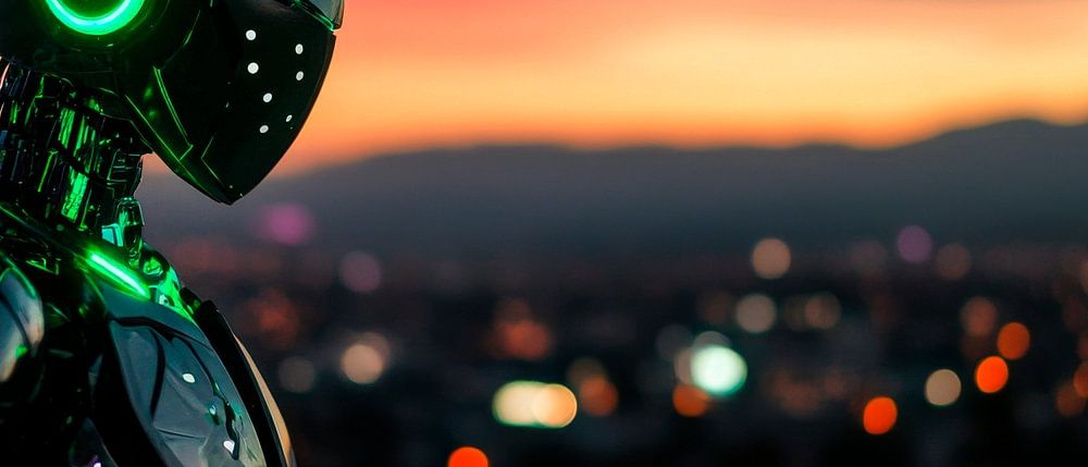 Ein faszinierender Blick auf die Zukunft! Die leuchtenden grünen Akzente des Roboters kontrastieren eindrucksvoll mit dem sanften Abendhimmel. Seine kontemplative Haltung und das pulsierende Stadtleben im Hintergrund schaffen eine Atmosphäre von Innovation und Staunen. Ideal für ein modernes Wohnzimmer oder ein kreatives Büro, wo Technologie und Inspiration Hand in Hand gehen.