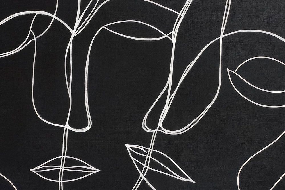 Zwei stilisierte Gesichter, elegant in feinen, weißen Linien auf tiefschwarzem Grund, kreieren ein fesselndes Duett der Emotionen. Diese minimalistische Komposition strahlt Ruhe und Intimität aus, ideal für das Schlafzimmer oder Wohnzimmer, wo sie Gesprächsstoff schafft und einen Hauch von moderner Kunst verleiht.