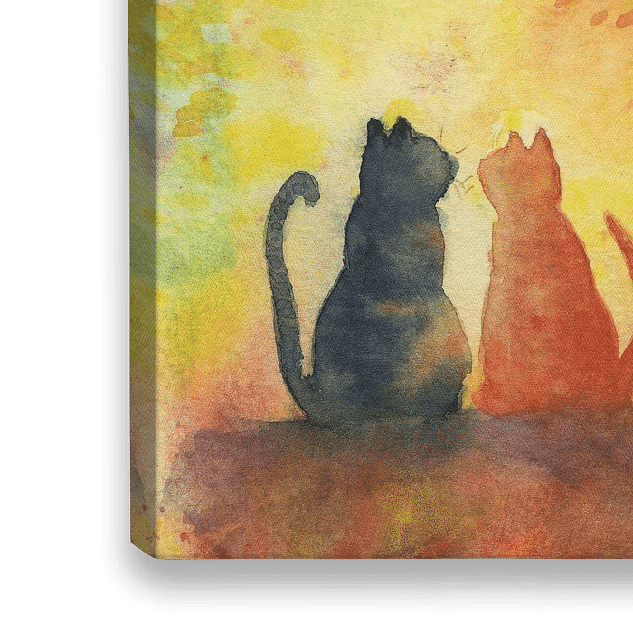 Zwei Katzen sitzen nebeneinander und blicken in den Sonnenuntergang. Die Katzen sind als Silhouette dargestellt, die linke Katze in dunkleren Farben, die rechte Katze in Rottönen. Die beiden Tiere werden umgeben von einer leuchtenden Explosion aus Rot-, Orange- und Gelbtönen. Das bunte Herbstlaub, von der Herbstsonne angestrahlt, fällt von den Bäumen und taucht die Umgebung in warme Farben. Die Szene vermittelt ein Gefühl von Wärme, Frieden und Liebe.