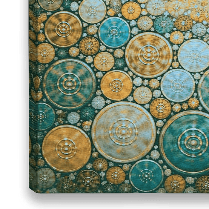 Bestelle dieses Landschafts-Wandbild abstrakte Hügel mit dekorativen Kreisen in Türkis und Orange von Claudia Gründler als Reproduktion auf Leinwand, Alu-Dibond, als Poster, Fototapete oder Acrylglasbild.