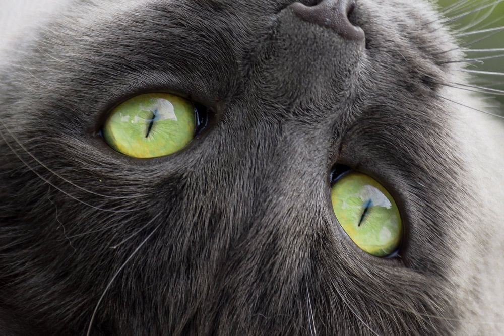 Katze mit grünen Augen auf dem Rücken liegend
