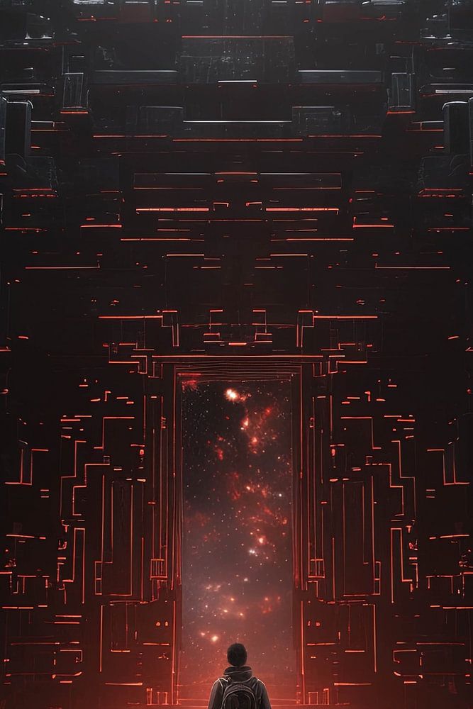 Die Tür an der Vorderseite des Kastens ist der Brennpunkt der Komposition und leuchtet in einem intensiven Rot. Diese Tür symbolisiert den Zugang zur unbekannten digitalen Welt, während das allmähliche Aufleuchten der digitalen Teile um sie herum den fortschreitenden Einfluss der Technologie auf unser Leben widerspiegelt.