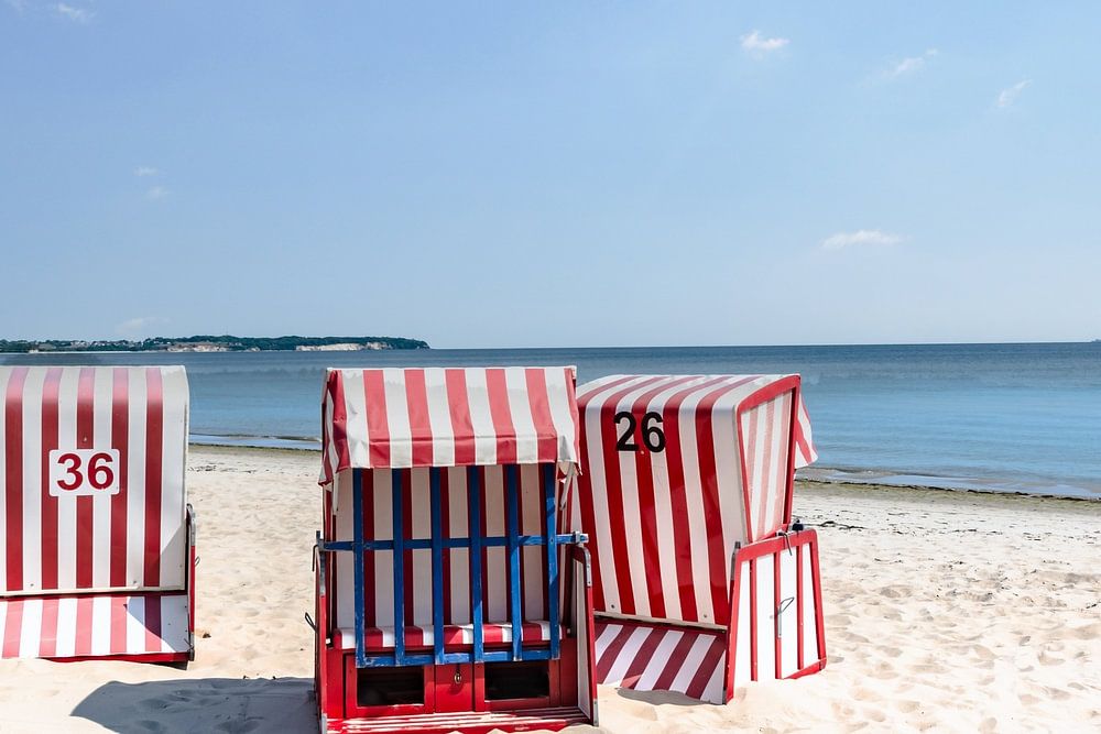 Ein idyllisches Strandpanorama erfasst die malerische Szenerie des Ostseebads Thiessow auf der Halbinsel Mönchgut auf Rügen. Fünf charmante Strandkörbe sind harmonisch entlang des Strandes platziert und laden zu erholsamen Momenten ein. Die sanften Wellen des Meeres umspülen den feinen Sandstrand und erzeugen eine beruhigende Atmosphäre. Die warmen Farben des Sonnenuntergangs tauchen die Szene in ein faszinierendes Lichtspiel, das den Betrachter in seinen Bann zieht.