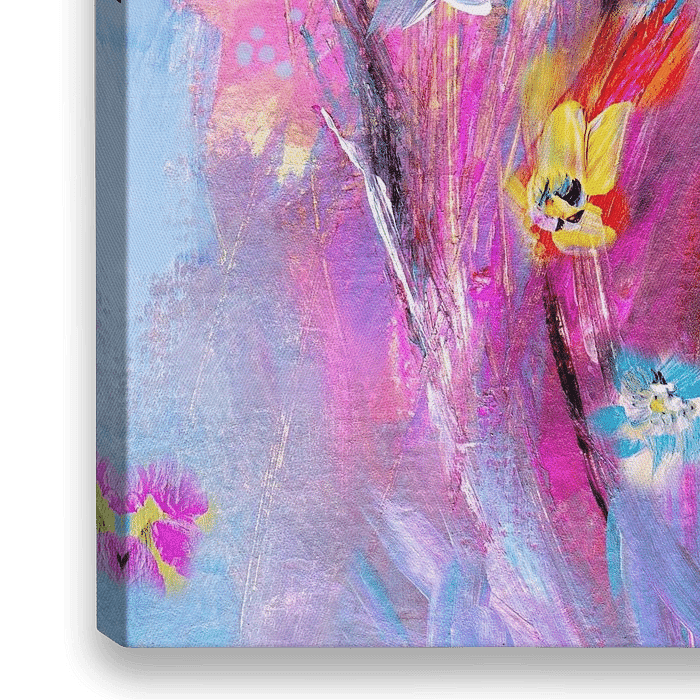 Blumenbild in Acrylfarben. Ein farbenfrohes und expressives Bild für den Wohnbereich. Es strahlt Optimismus und Heiterkeit aus. Dominierende Farben sind Pink und Blau.