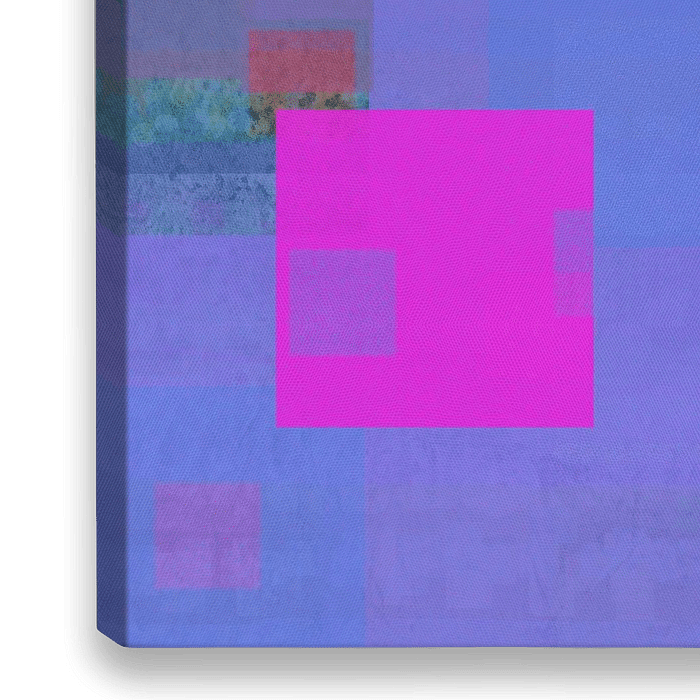 Bestelle dieses abstrakte Wandbild geometrische Landschaft Pink Blau Lila von Claudia Gründler als Reproduktion auf Leinwand, Alu-Dibond, als Poster, Fototapete oder Acrylglasbild.