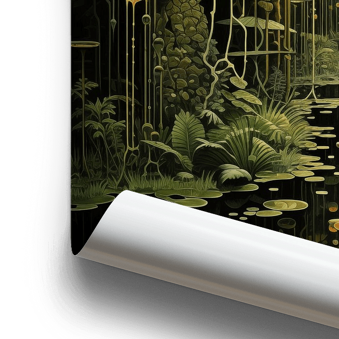 Geometrischer Druck eines Regenwaldes mit Grün- und Orangetönen.