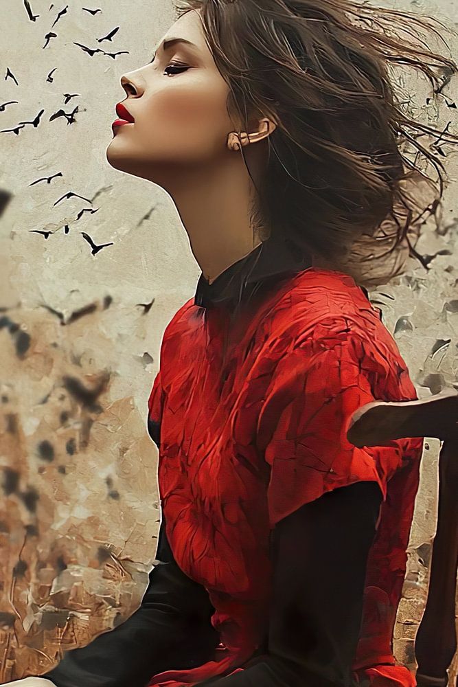 Ein Gemälde zeigt eine junge Frau, die auf einem einfachen Stuhl sitzt, umgeben von schwarzen Vögeln, die um sie herumfliegen. Ihr sanfter, verträumter Blick verleiht der Szene eine heitere Atmosphäre, während die Vögel Freiheit und Harmonie symbolisieren. Die zarten Pinselstriche und weichen Farbtöne vermitteln ein Gefühl von Frieden und Verbundenheit mit der Natur.