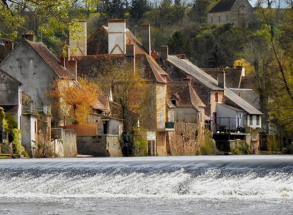 Der Fluss l'Aumance fließt mitten durch die historische Stadt Hérisson, die in der Allier in Frankreich liegt.