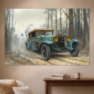 Zeichnung eines Oldtimers "Vintage Forest Adventure" von Peter Pen Zeichnungen und Gemälde