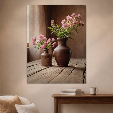 2 braune Vasen mit rosa Blumen auf altem Holztisch von Jan Bouma