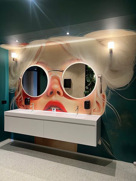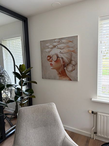 Brillen verleihen Porträts das gewisse Etwas. Sie verbergen, lenken den Blick, setzen starke Akzente. In dieser Kollektion tragen die Figuren oft runde, verspiegelte Modelle, die Landschaften, Sonnenuntergänge oder schwimmende Goldfische spiegeln - ein Fenster zur Fantasie. Die Farbwelten aus Teal, Bronze und Salbeigrün passen ideal zu ruhigen, modernen Interieurs, in denen Persönlichkeit und Ruhe zusammentreffen. Strand-Vibes IV von Mirjam Duizendstra zeigt, wie verspielt und träumerisch Brillen wirken können.