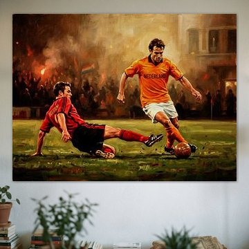 Leuchtende Farben in einem Kunstwerk entfalten ihre Wirkung am besten, wenn du sie mit zurückhaltenden Wandtönen kombinierst. Braun, Grau oder Weiß aus den Kollektionsdaten schaffen einen ruhigen Hintergrund, der das Motiv in den Mittelpunkt rückt. Die warmen Orange- und Gelbtöne in Fußballspiel Niederlande gegen Brasilien – Lebendiges Ölgemälde kommen so besonders gut zur Geltung.