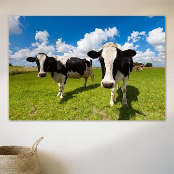 Neugierige niederländische Kühe auf einer grünen Wiese im Sommer von Bas Meelker