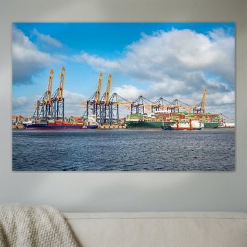 Blau- und Grautöne dominieren Hafenaufnahmen natürlich - sie bringen maritime Kühle mit. Kombiniere sie mit warmen Textilien oder Holzelementen in deinem Raum, um eine ausgewogene Atmosphäre zu schaffen. Die Farbpalette in Containerschiff Tihama von Hapag Lloyd. harmoniert besonders gut mit hellen Holzmöbeln oder beigefarbenen Stoffen.