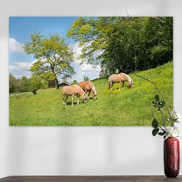 Diese Sammlung feiert den robusten Charme des Haflinger Pferdes, festgehalten von verschiedenen Künstlern. Die Kunstwerke, die von Gemälden und Fotografien bis hin zu Collagen und digitaler Kunst reichen, zeigen den kräftigen Körperbau und den freundlichen Ausdruck dieser Pferde. Die Künstler haben sich auf die charakteristischen blonden Mähnen und den robusten Körperbau des Haflinger Pferdes konzentriert.