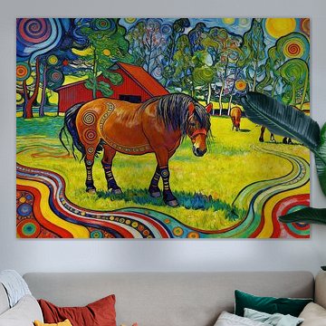 Lebendige Farbkombinationen bringen Energie in Räume, in denen du kreativ arbeitest oder dich inspirieren lassen möchtest. Die kraftvollen Grün-, Orange- und Lilatöne passen gut zu hellen, neutralen Wänden und setzen einen dynamischen Akzent - wie bei Buntes galoppierendes Pferd in Bewegung, das durch seine farbige Ausdruckskraft besonders in Ateliers oder Arbeitszimmern wirkt.