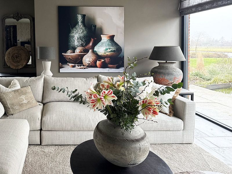 Die Marokko-Kollektion entfaltet ihre volle Wirkung, wenn du sie mit warmem Holz, natürlichen Textilien und Pflanzen kombinierst. Die ruhigen und nostalgischen Motive passen wunderbar zu erdigen Materialien wie Rattan, Terrakotta oder groben Leinen. Für einen lebendigen Akzent kannst du die Kunstwerke aus Marrakesch mit bunten Kissen oder einem handgeknüpften Teppich ergänzen. An einer Bilderwand wirken die verschiedenen Formate - Hochformat, Quadratisch und Querformat - besonders gut zusammen. Lass die Farben Braun, Taupe, Blau, Bronze und Beige durch Vasen, Kerzenhalter oder Keramik im Raum aufgreifen - so entsteht ein stimmiges Gesamtbild mit orientalischem Flair.