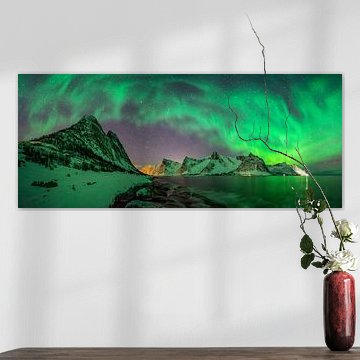 Aurora-Panorama über der Felsenküste von Tugeneset mit dem Kliptinden-Gebirge im Hintergrund, Senja, von Wojciech Kruczynski