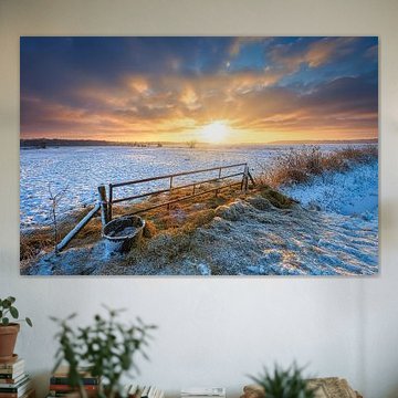 Winter in Drenthe mit einem schönen Sonnenaufgang und Schnee über den Wiesen. von Bas Meelker
