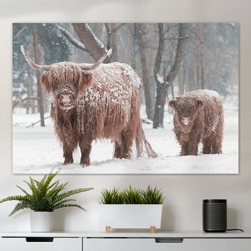 Schottische Hochlandrinder mit einem Kalb im Schnee von Sjoerd van der Wal Fotografie