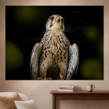 Die warmen Braun- und Beigetöne in Der Falke ergänzen sich wunderbar mit natürlichen Materialien wie Holz oder Rattan. Kombiniere das Bild mit textilen Akzenten in Taupe oder Bronze, um eine ruhige, erdige Atmosphäre zu schaffen. Die hellen Farbtöne im Gefieder heben sich dabei sanft von der Umgebung ab.