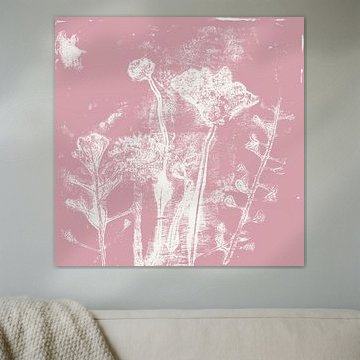 Abstrakte botanische Kunst. Blumen und Pflanzen in rosa und weiß von Dina Dankers