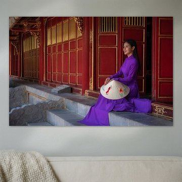 Vietnamesische Frau sitzt auf den Stufen des Tempels von Anges van der Logt
