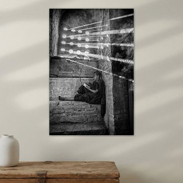 Junger Mönch liest Gebetbuch auf der Fensterbank eines Klosters in Baghan bei starkem Sonnenschein von Wout Kok