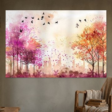 Bunte Skyline mit Herbstbäumen und Vögeln von Art & Soul Creations