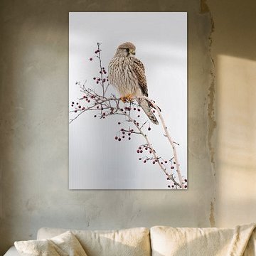 Turmfalke ( Falco tinnunculus ) aufgebäumt auf einem Busch mit roten Beeren (Mehlbeeren) von wunderbare Erde