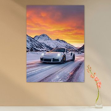 Porsche 911 GT3 RS auf einer verschneiten Bergstraße bei Sonnenuntergang von John Dan